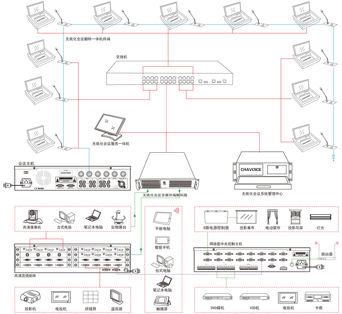 - 具備集中控制功能,可控制所有會議終端一鍵開/關(guān)機,會議音量、投影開關(guān)、信號切換、無紙化翻轉(zhuǎn)等功能;