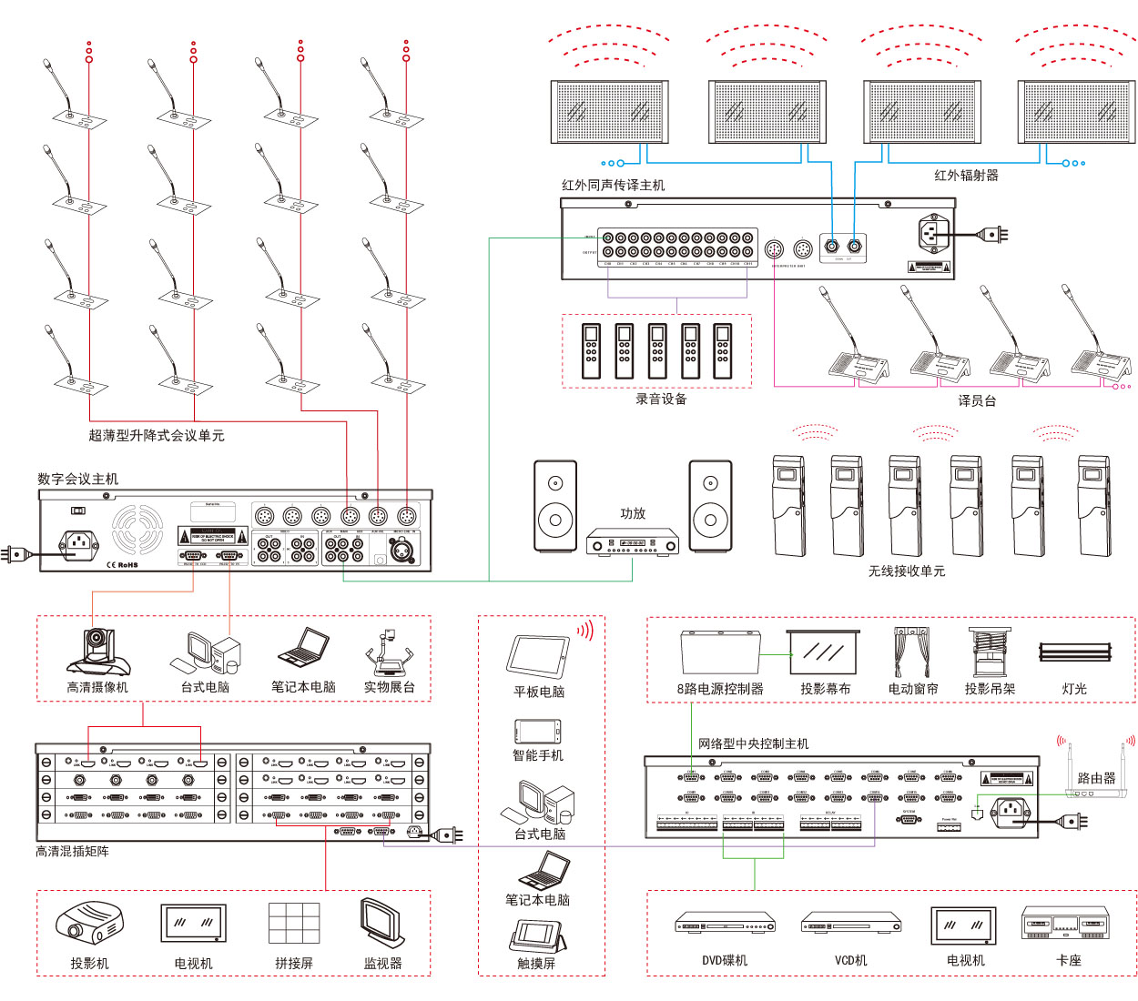 - 低功耗設(shè)計,單路可連接30臺升降式會議單元;